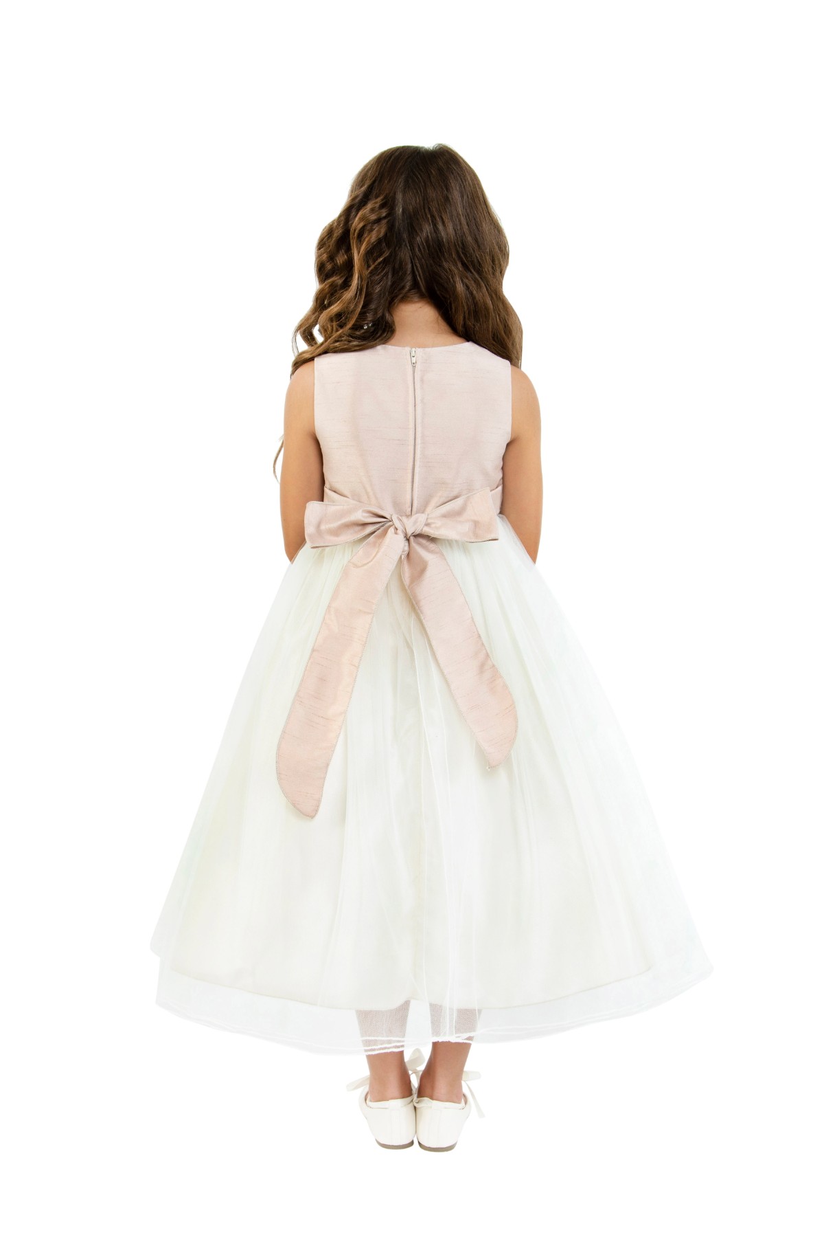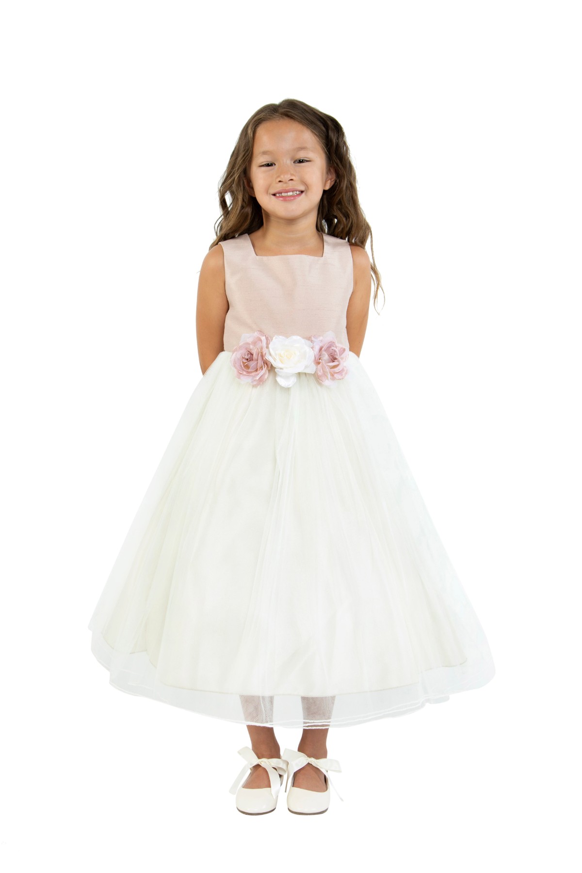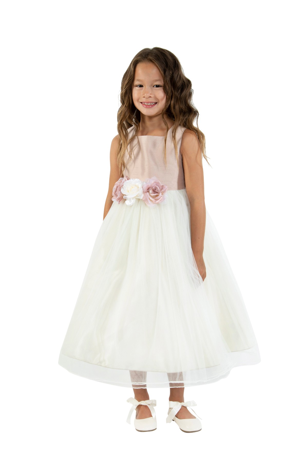Classic flower girl dress. Textured silk like bodice with tulle skirt. Comes with three elegant flowers on waist. Please note the flower colour may vary.