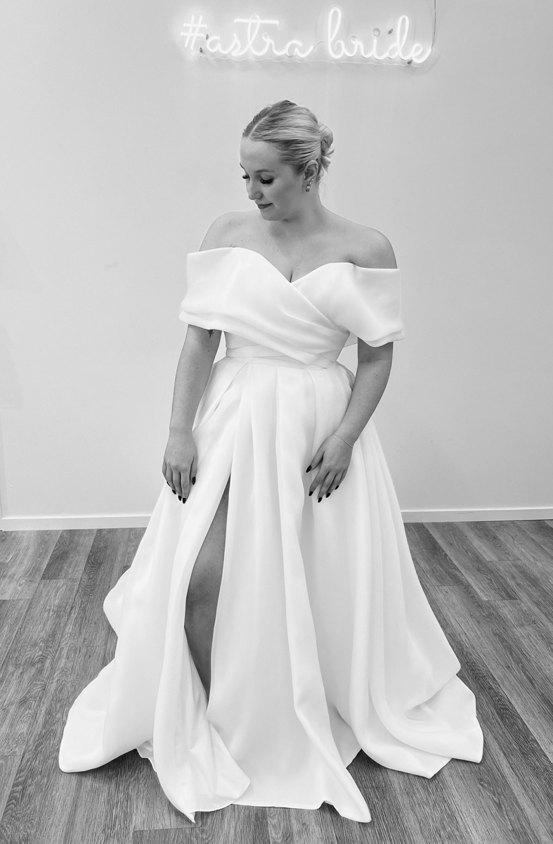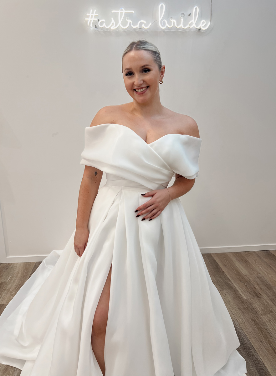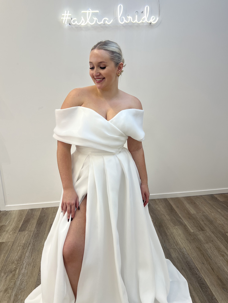 Minimalist yet striking, the Canberra Gown is ideal for the modern bride seeking clean lines, timeless beauty, and effortless sophistication.