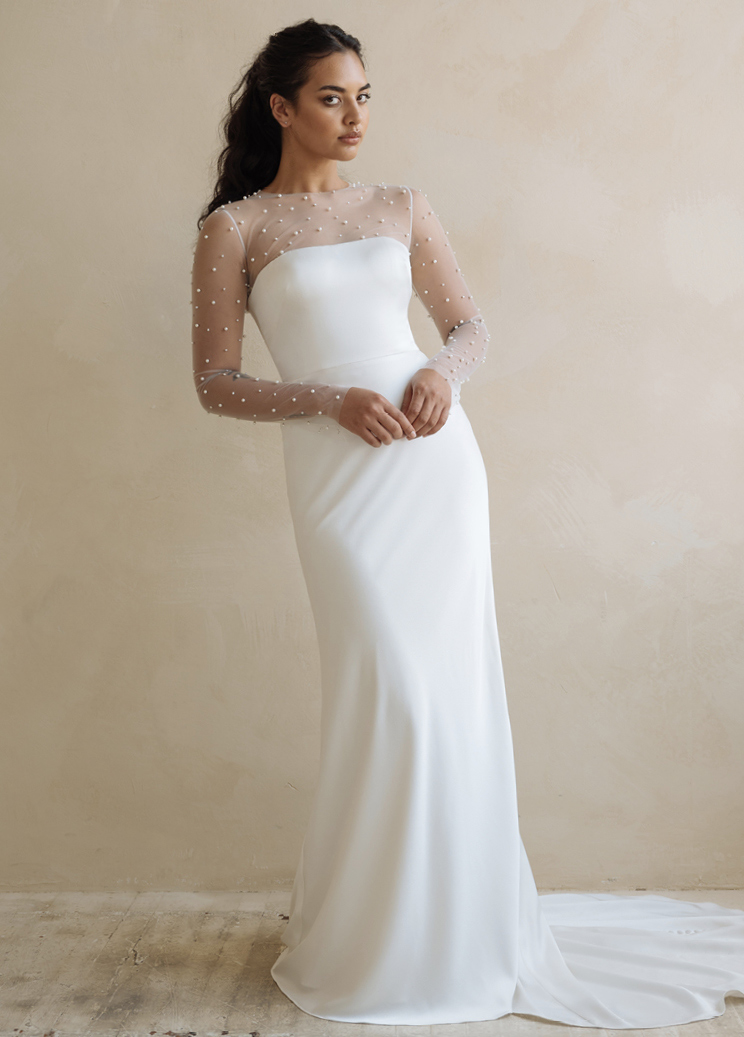The Morgan gown feels truly modern, with thoughtful details added for a timeless effect. The sleek, chic straight neckline is balanced by a sheer illusion sleeve and neckline dotted with everyone’s favorite bridal accessory, pearls