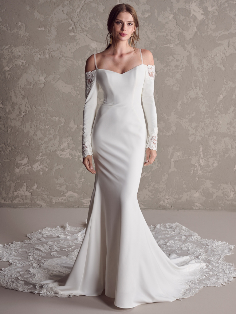 Long Sleeve Crepe Bridal Gown With Sweetheart Neck And Intricate Illusion Lace Back