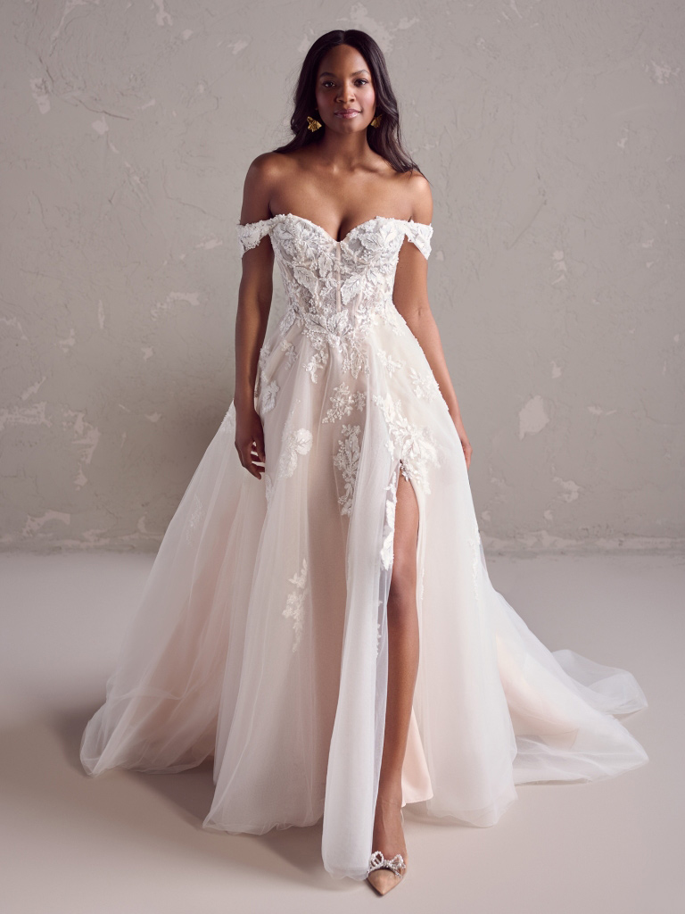 Beaded Floral Wedding Dress With An Illusion Bodice And Off-The-Shoulder Cap-Sleeves