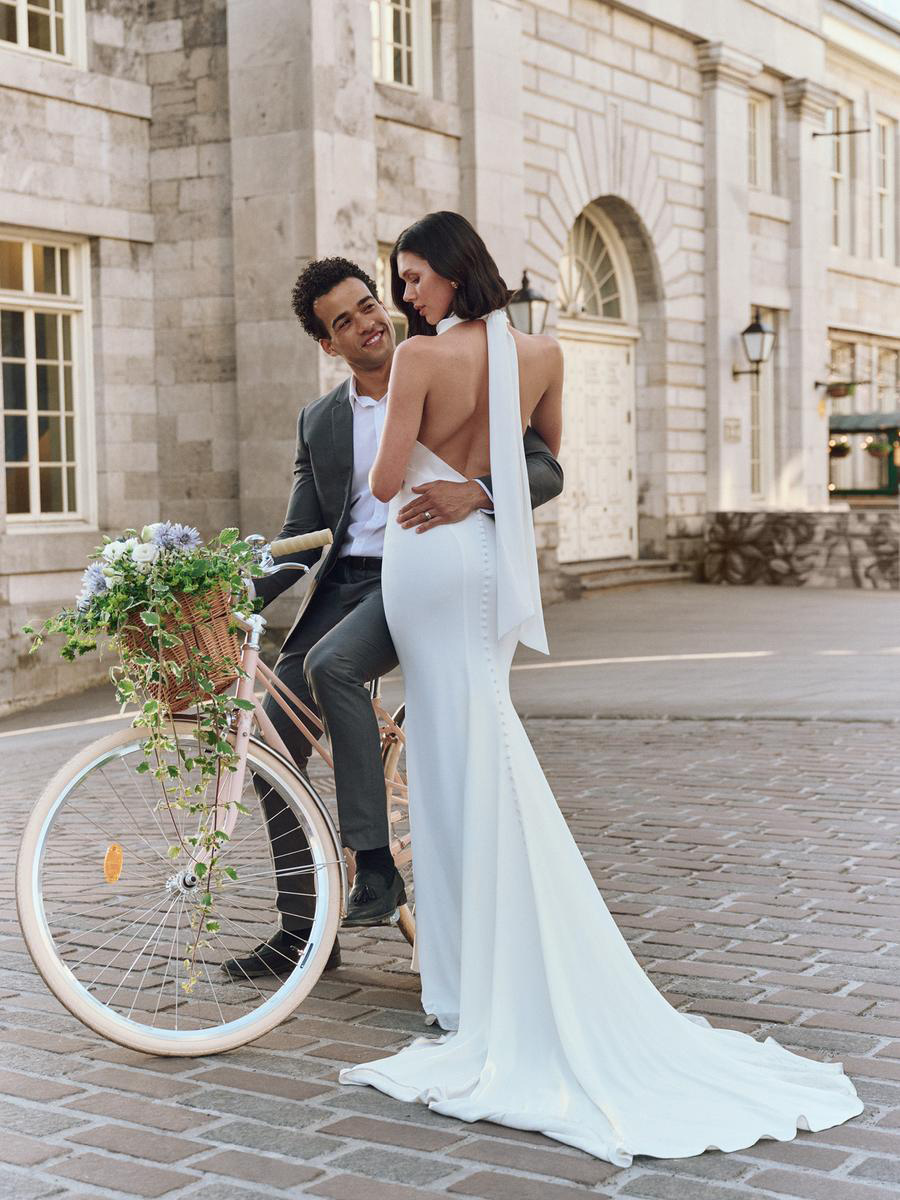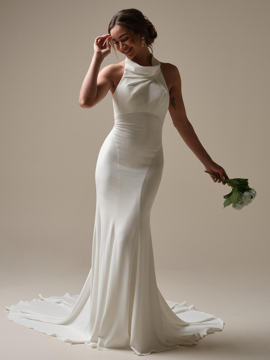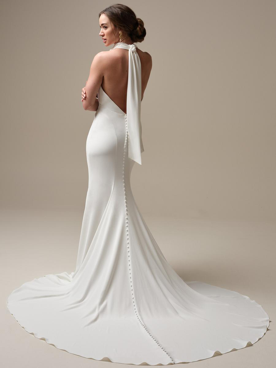 Regal backless crepe sheath wedding dress