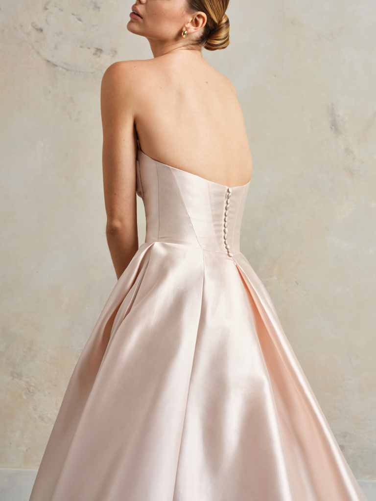 Strapless asymmetrical draped Mikado bridal gown