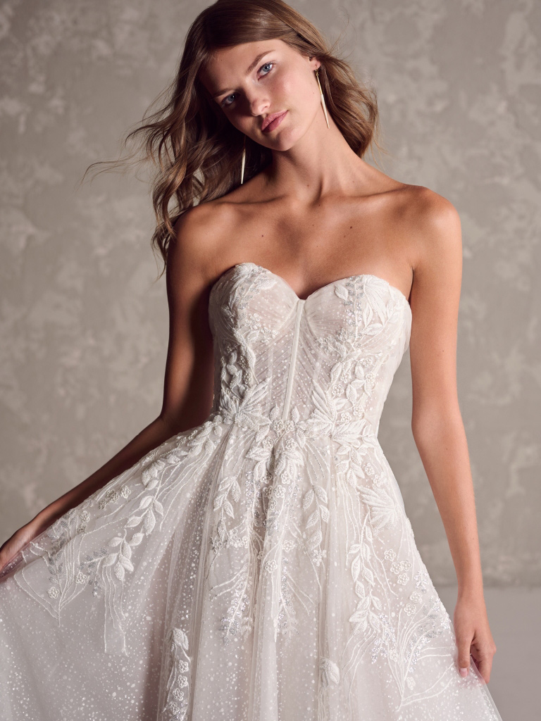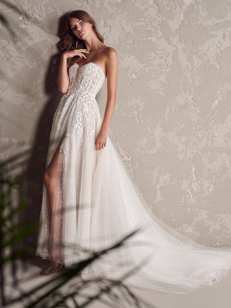 Unique A-Line Wedding Gown With Beaded Floral Details And A Thigh-High Slit